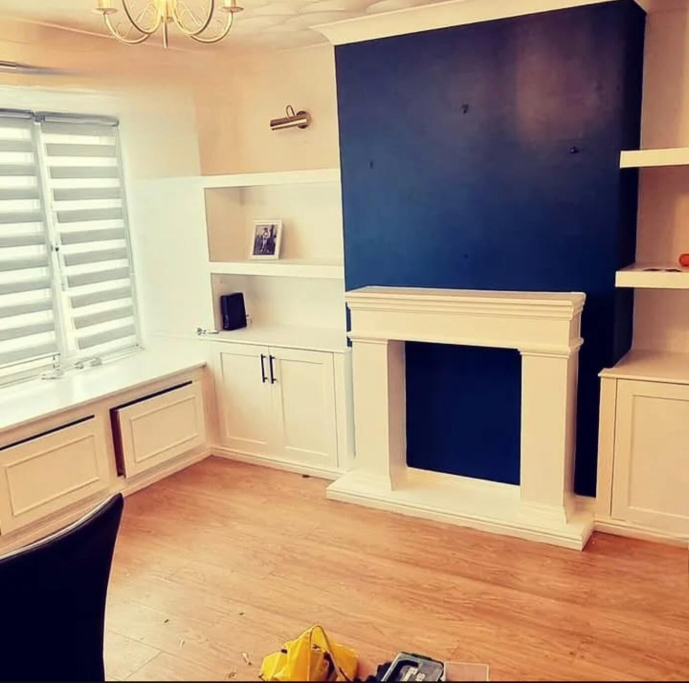 A modern, made to measure built in unit crafted MDF board, Smooth surface, milled fronts, and carefully selected details give the whole pieces an elegant and cohesive look.